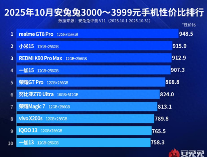 在这片看似无穷内卷的战场上,真我GT8 Pro的登场,像是一记打破常规的重拳,它不仅要卷配置,更要重新定义“性价比旗舰”的意义。从安兔兔最新公布的3000元档手机性价比榜单来看,真我居然拿下了第一名。真我GT8 Pro在性能、影像、设计和续航上全面爆发,让其他厂商的“高性价比”显得有些单薄。