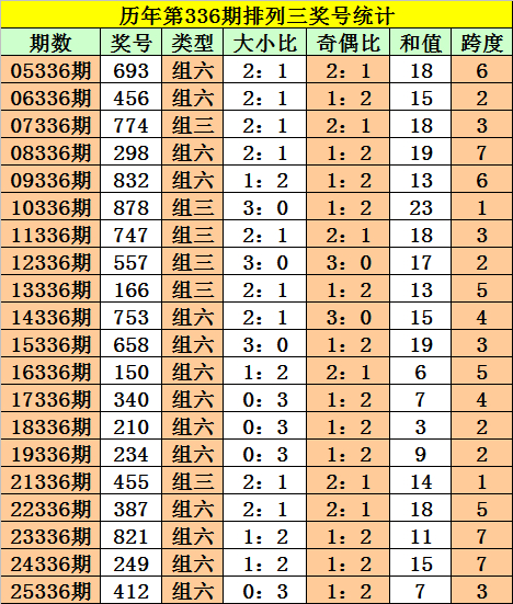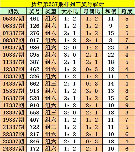历年第337期奖号中:组三开出3次,组六开出16次。组三较少,本期注意组三反弹。