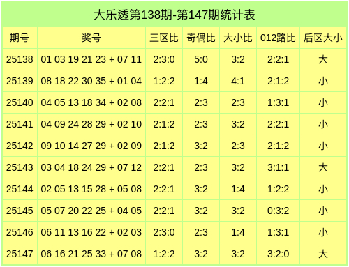 大小分析:上期大数明显较热,开出大小比3:2,最近10期前区奖号大小总比例为25:25,大小出号均匀。本期看好大数概率较小,参考大小比2:3。