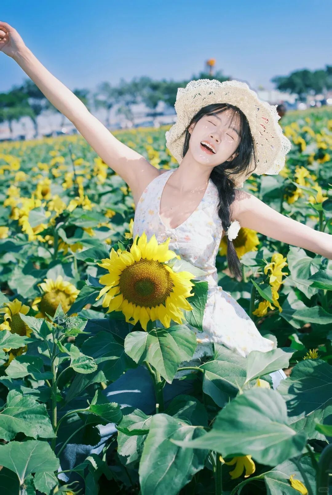 ③ 穿白色、浅蓝色小裙子或简约牛仔装,和黄色花海形成清新对比,动态抓拍更自然
